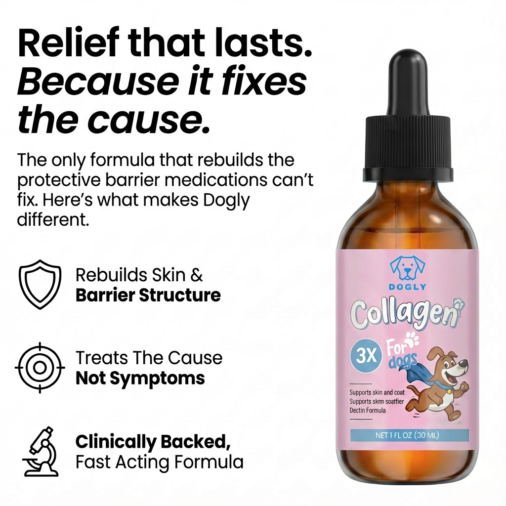 Dogly Collagen provides the raw materials (Type I and III collagen) the body needs to actually repair the barrier. When you replenish these daily, the barrier strengthens, allergens stay out, and the immune system finally calms down.